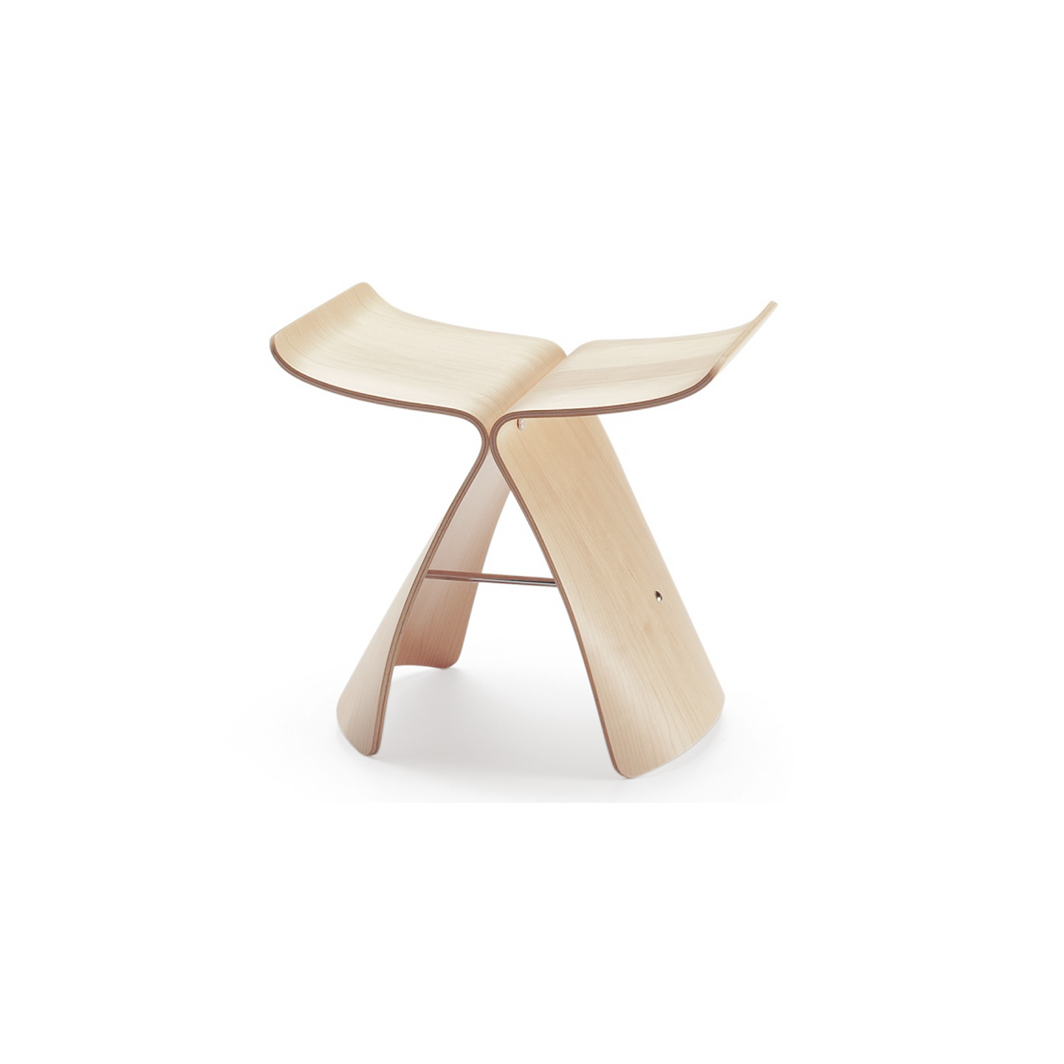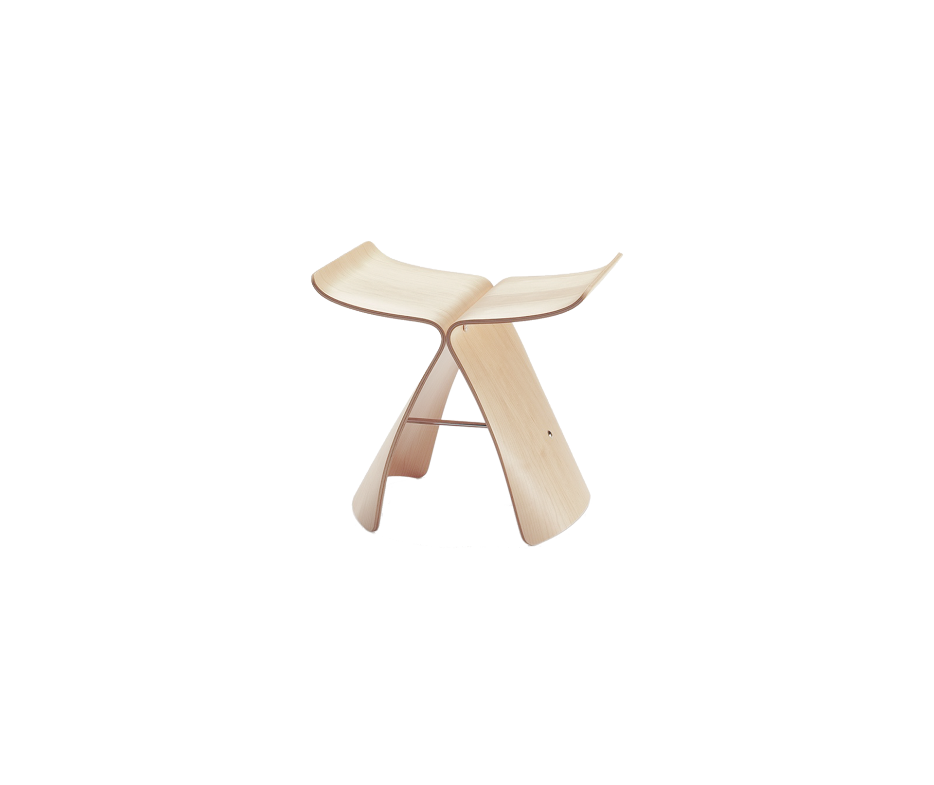 [Finishes: maple] | The iconic Butterfly Stool by the Japanese designer Sori Yanagi is a classic piece of furniture that uniquely combines Eastern forms with the plywood moulding technique developed by Charles and Ray Eames. The gently curving silhouette of the twin seat shells is reminiscent of a butterfly's wings – eternally poised for flight. | 420 x 390 mm Material: moulded plywood with a lacquer finish, brass fittings. | Butterfly Stool Specifications