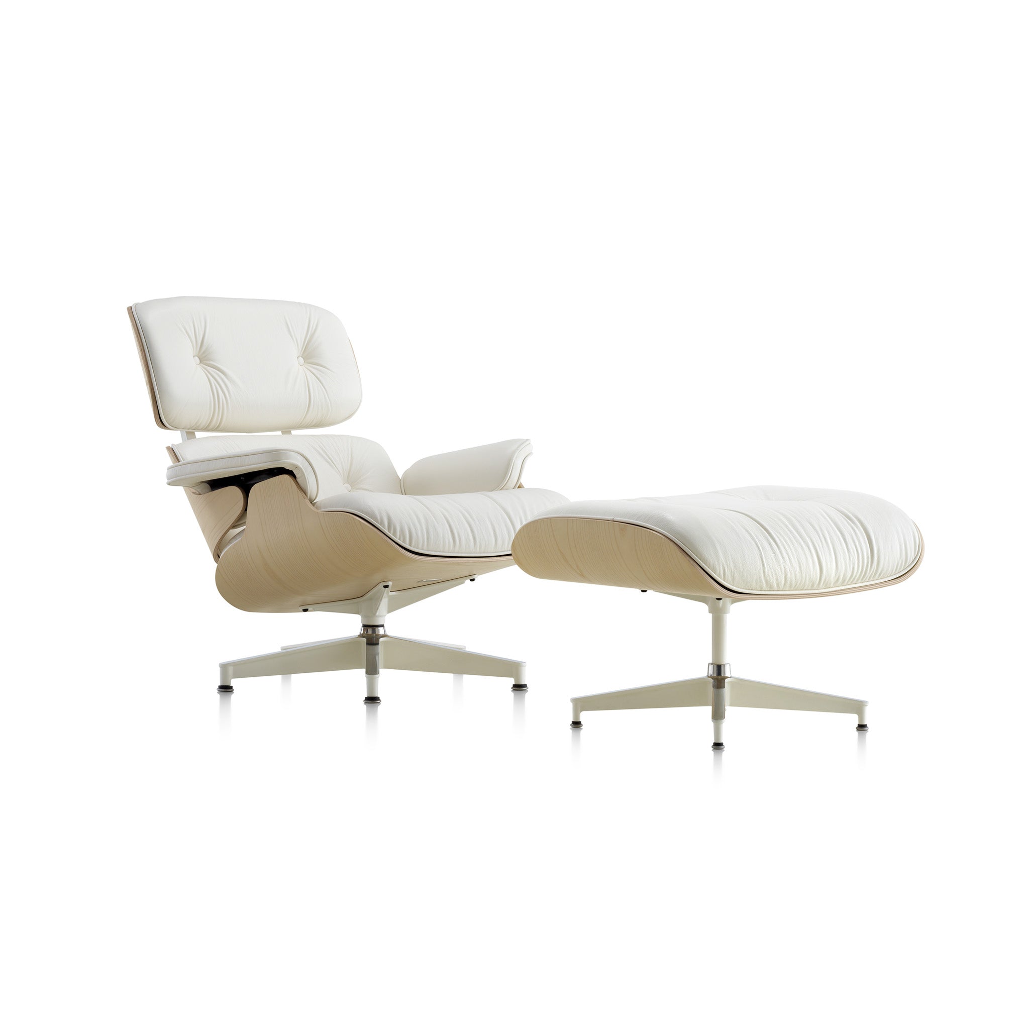 [Finishes: white ash, Alpine white leather] | The iconic Eames Lounge Chair and Ottoman, originally released in 1956, began with the designers' desire to create a chair with "the warm, receptive look of a well-used first baseman's mitt." The result embodies what it really means to relax. In continuous production since its introduction, this authentic contemporary lounge chair is assembled by hand to ensure the highest level of quality and craftsmanship. | Shell: white ashUpholstered in Category 9 Leather AlpineWhite enamel base | Eames® Lounge Chair and Ottoman Specifications