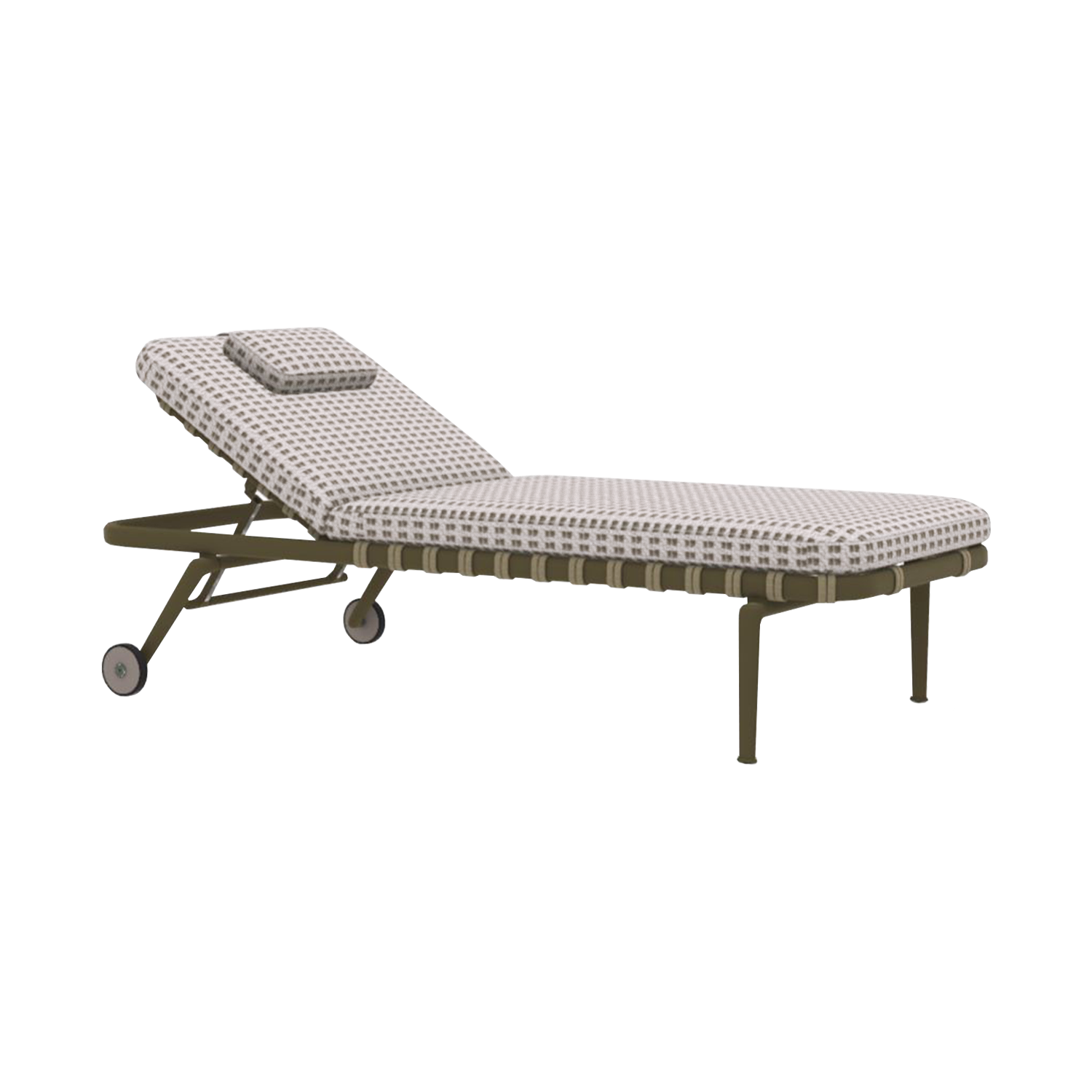 [Finishes: Lamone 425, Hay green / olive bronze] | The Erica sunbeds take up the elements that characterize the outdoor seating collection of the same name: the powder-coated die-cast aluminium structure which offers lightness and durability and the interlacing in polypropylene strips reinforced by a high-resistance internal core. Comfort and practicality are guaranteed by the backrest that can be adjusted in different positions, by the padded mattress and by the design that makes them stackable. The wheels they are equipped with allow them to be moved easily. | 98 x 200 x h44 cm | Lounger with wheels, adjustable back and headrest | Finish: Hay green polypropylene interlacing | Fabric: Lamone 2821425 | Frame: Olive bronze frame | Erica '25 Sunbed Specifications