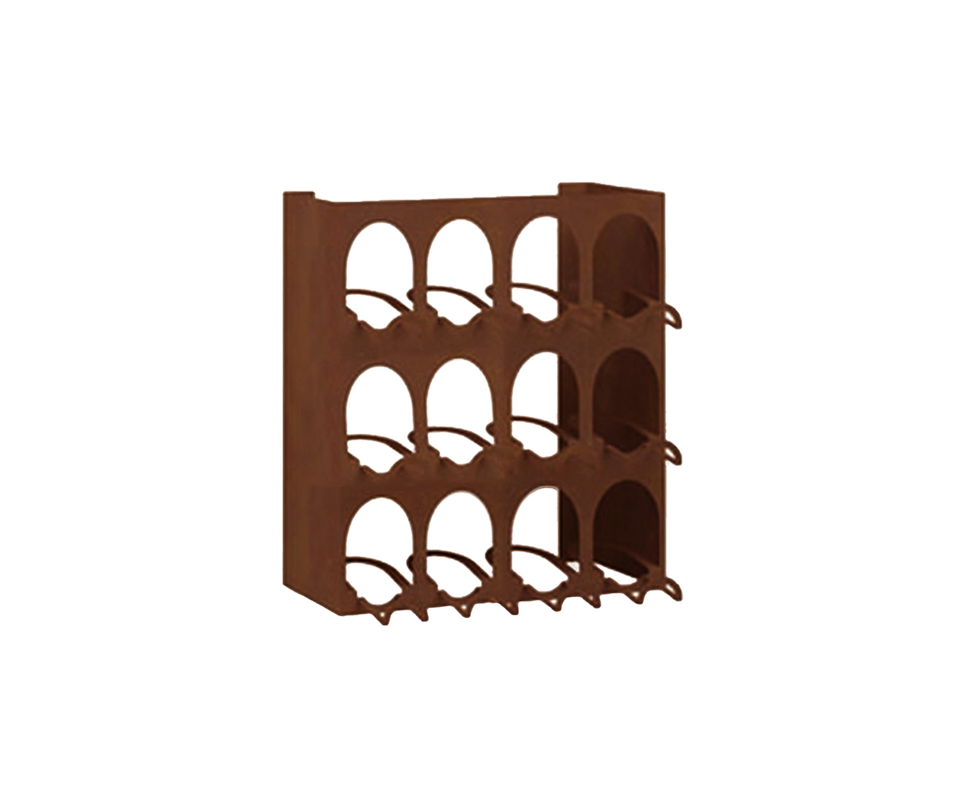 [Finishes: Corten] | This rack allows you to equip walls of areas from within the kitchen, to the walls of large wine bars, bars or restaurants. Ideal for attics or lofts, for places of conversation with friends or for wine tasting rooms, this storage system fills the unused spaces furnishing them with refined simplicity. It is the cutting edge solution for storing precious bottles and naturally adapts to convivial environments. The warmth transmitted by the precious wood essences and the paintings that recall the colors of the wine make it a truly unique piece of furniture. | 50 x 24/34 x h50 cm | Capacity: 12 bottles in horizontal position | Finish: Corten | Libreria del Vino Wine Storage Specifications
