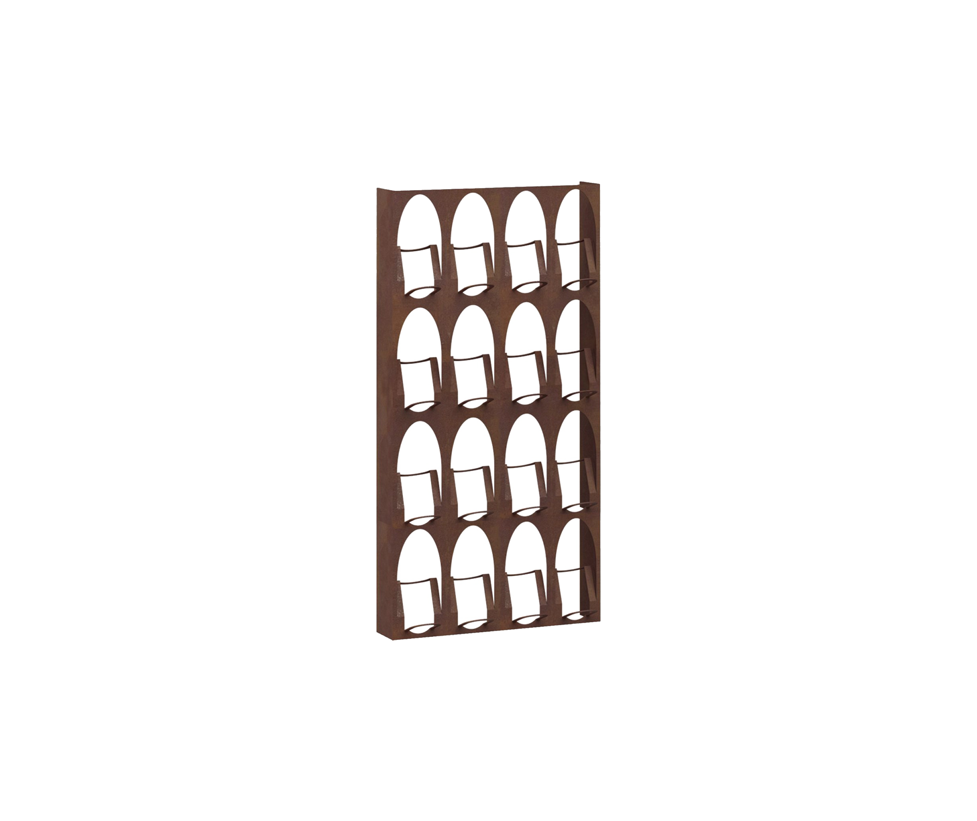 [Finishes: Corten] | Libreria de Vino Wine Storage Specifications | This rack allows you to equip walls of areas from within the kitchen, to the walls of large wine bars, bars or restaurants. Ideal for attics or lofts, for places of conversation with friends or for wine tasting rooms, this storage system fills the unused spaces furnishing them with refined simplicity. It is the cutting edge solution for storing precious bottles and naturally adapts to convivial environments. The warmth transmitted by the precious wood essences and the paintings that recall the colors of the wine make it a truly unique piece of furniture. | 50 x 12/18 x h100 cm | Capacity: 16 bottles in vertical position | Finish: Corten