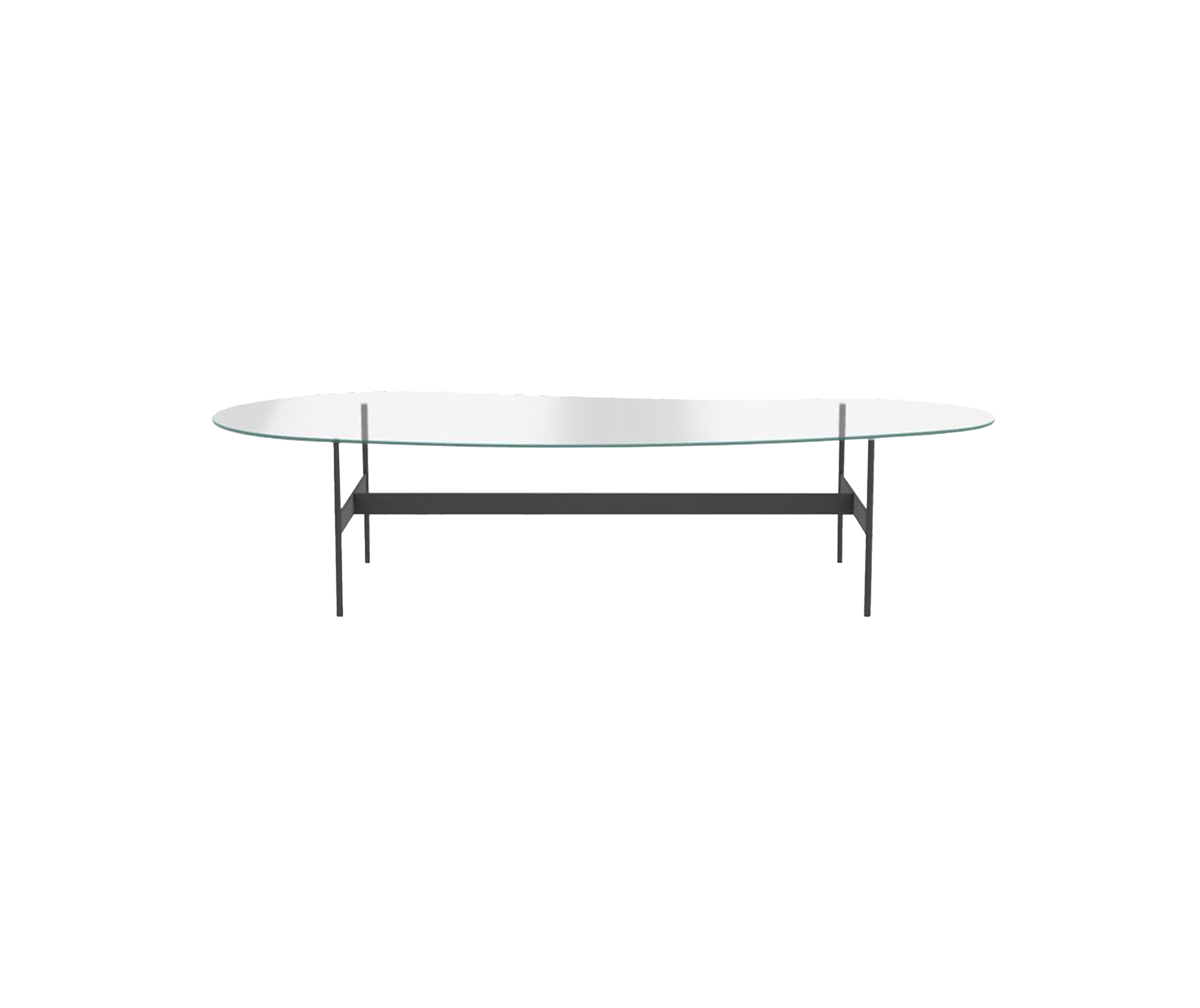 [Finishes: Extra light glass, Pewter painted] | Lightness and simplicity distinguish Formiche (Ants in English) complements. The slender support frame (making reference to the name), with its shape and finish, picks up the theme of the feet in the sofa system. The rounded support of painted steel is connected by crosspiece to support the tops in different shapes, round, oval, or “kidney bean”. Formiche's various shapes and heights make it possible to compose different support systems. The tops themselves, made of several finishes, have a fine thickness of 8 mm. | 140 x 68.5 x h32.5 cm | Top: extra light glass | Frame: pewter painted | Formiche Low Table Specifications