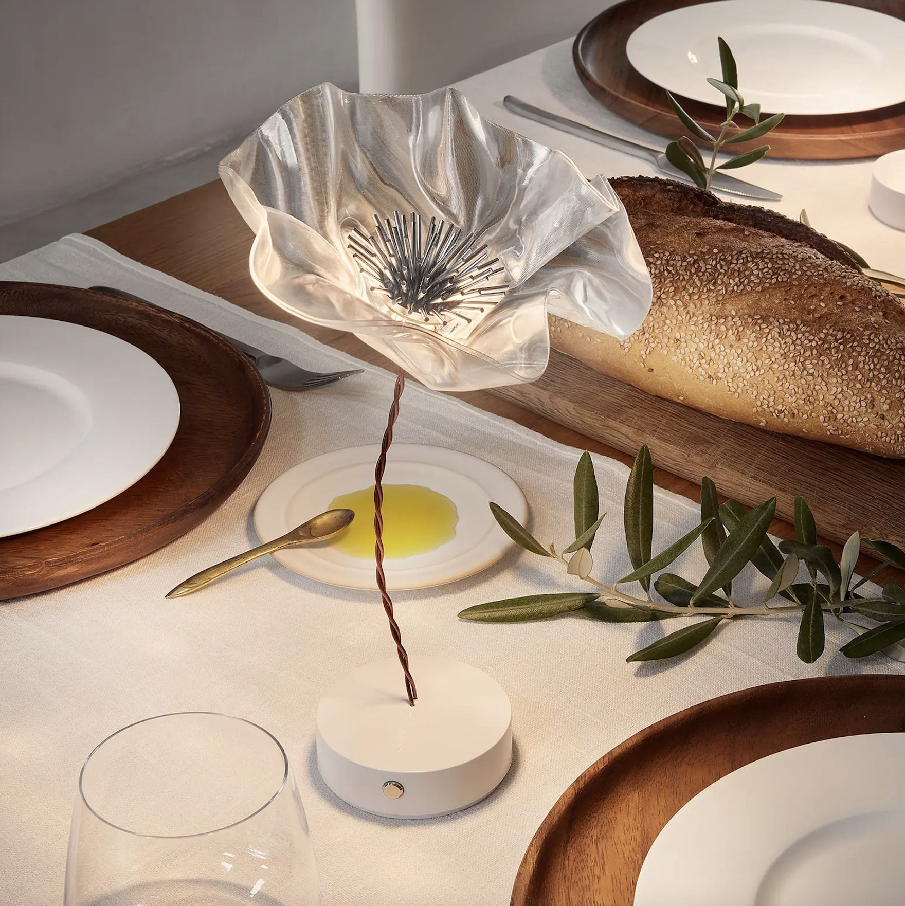 Marc Sadler pushed the boundaries of Slamp’s exclusive technopolymers, creating a new compositional language: the delicate, battery-powered LaFleur is a hand-molded bloom, slowly sculpted using temperature-controlled Lentiflex. Both the prisma and velvet versions have a matte magnetic base, in white or black, accompanied by a metal disc that firmly anchors the lamp under textiles for the perfect tablescape. | The battery lasts up to 60 hours, and can be recharged using a multi-port station fit for HO.RE.CA. Also available as an applique.