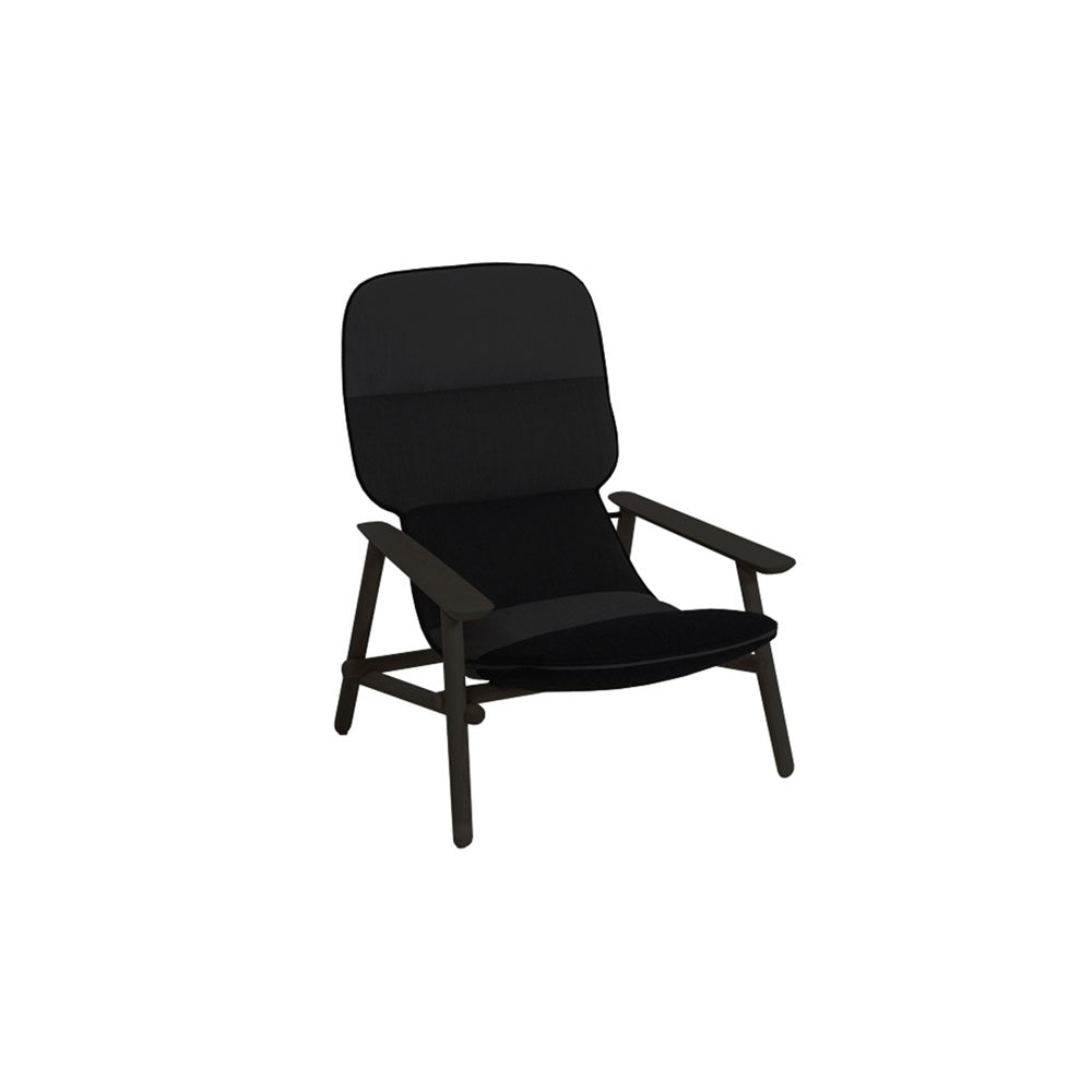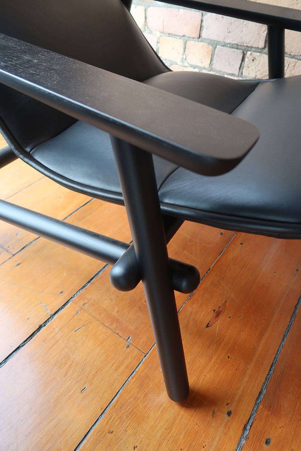 Inspirations and citations from Scandinavian design, from the modernist idea of the 1950s, from the work of the great masters of design and from Achille Castiglioni for whom, at the beginning of her career, she worked as assistant. The soft and accommodating armchair is also welcoming, demonstrating effectively a versatility of use which makes it perfect for public spaces and in the home. | 80 x 92 x 102 cm | Covering : B0242 Leather Black cirè Soft | Rim : B0242 Leather Black cirè Soft | Base : 093 Frassino nero Flame retardant | Lilo Armchair Specifications