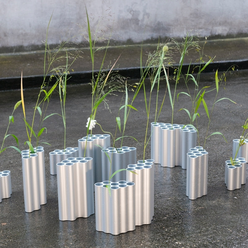 The Nuage vases produce an attractive interplay of light and shadow with their undulating shape and anodized aluminum finish in various colors. Flowers and grasses can be arranged in each cluster of eight individual tubes, and thanks to their precise outer contours, the vases can also be fitted together to create entire 'cloud formations'. | 19.5 x 11 x h13 cmFinish: light silver | Terms and conditions apply. | Nuage Vase Specifications