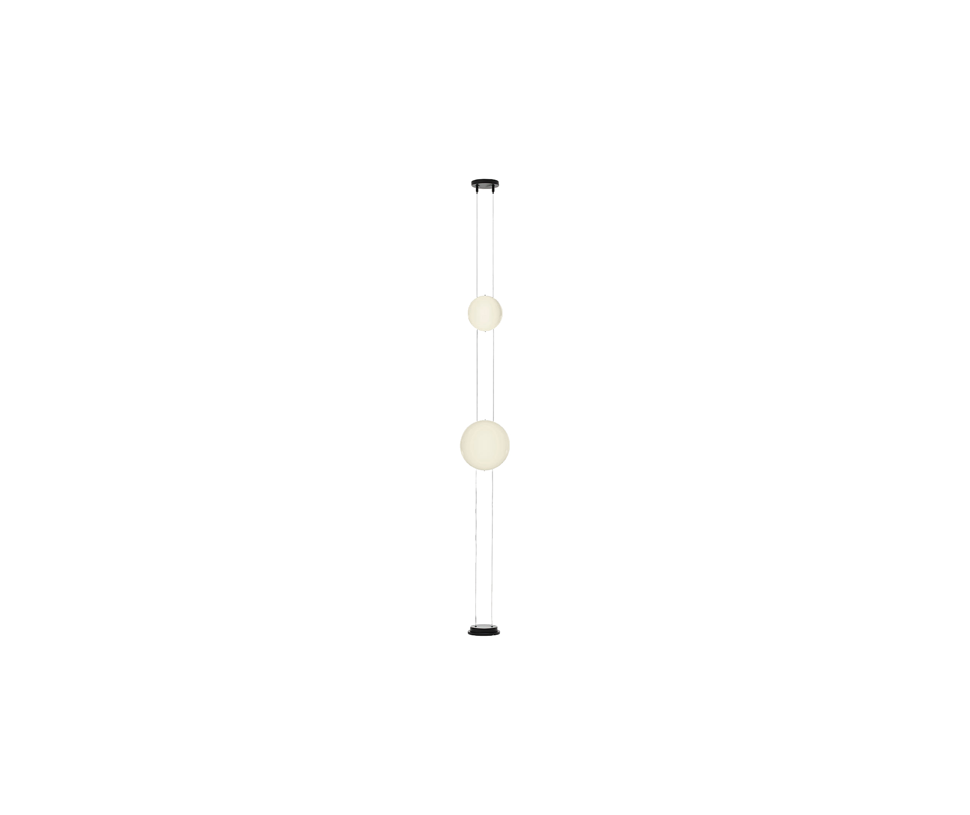 Ground-Ceiling Structure: 18 x 18 x 400cm H (max) | Dimmable floor-to-ceiling lamp with spherical opaque plastic diffuser sliding on parallel steel cables | Orbit Ball Shade: x1 Ø20 cm, x1 Ø28 cm | Ceiling floor lamp with diffused light. The spherical diffuser slides on parallel cables that cross it like tracks connected from the ground to the ceiling. The absence of a power cable makes Orbita's design extremely clean and essential. Like the sun rising and setting, the Orbita lamp can be adjusted in height and light intensity to create different lighting scenarios. | Orbit Floor Lamp Specifications