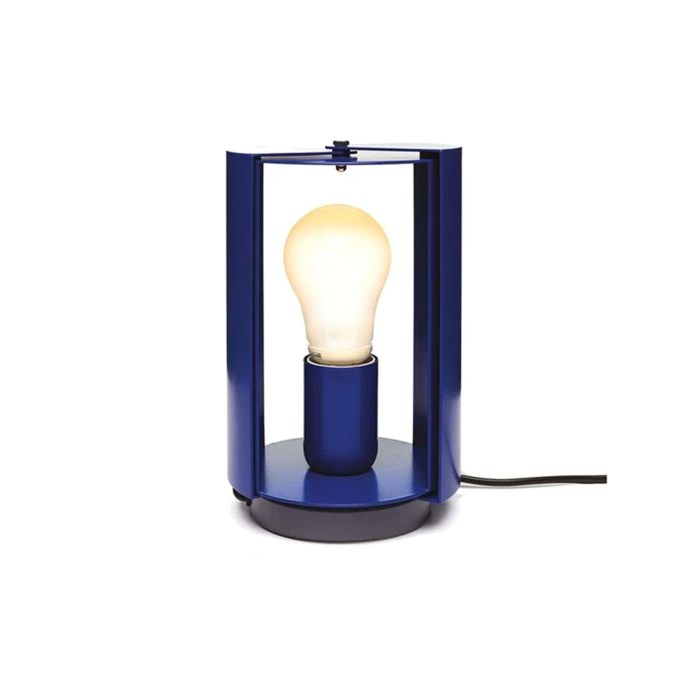 Innovative design for the 50s but still a contemporary table lamp. The lighting output is adjusted by the opening or closure of the volets. Its cylindrical body opens on two sides on which two diffusers rotate allowing the opening and closing of the light beam to adjust the light in a direct or indirect way. Steel base painted in matt grey, body in rolled metal sheet painted in white, yellow or blue. Switch on cable. | Finish: blue max power: 60W voltage: 230V adjustable shades excludes bulb | Pivotante À Poser Specifications