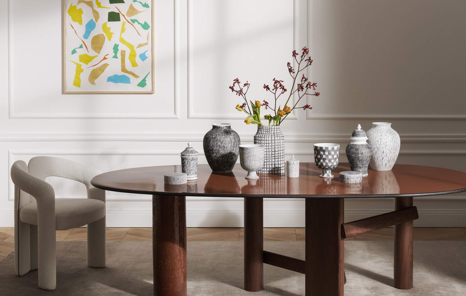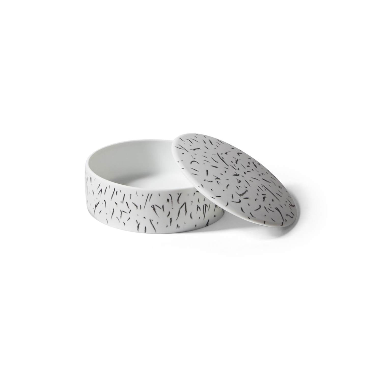 [Finishes: black touches] | The Formafantasma designs become decorations on the porcelain, thanks to the know-how, skills and experience of the Ginori 1735 master painters who, working with natural ease, leave their mark through instinctive gestures, abstract signs that contemporize the concept of the design. | Ø 13.2 x h5.3 cm | Hand-decorated white pocelain box | Finish: black touches | Post Scriptum Specifications