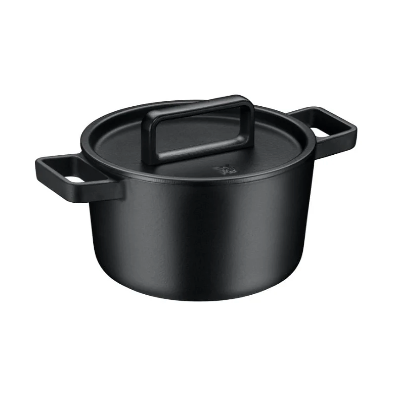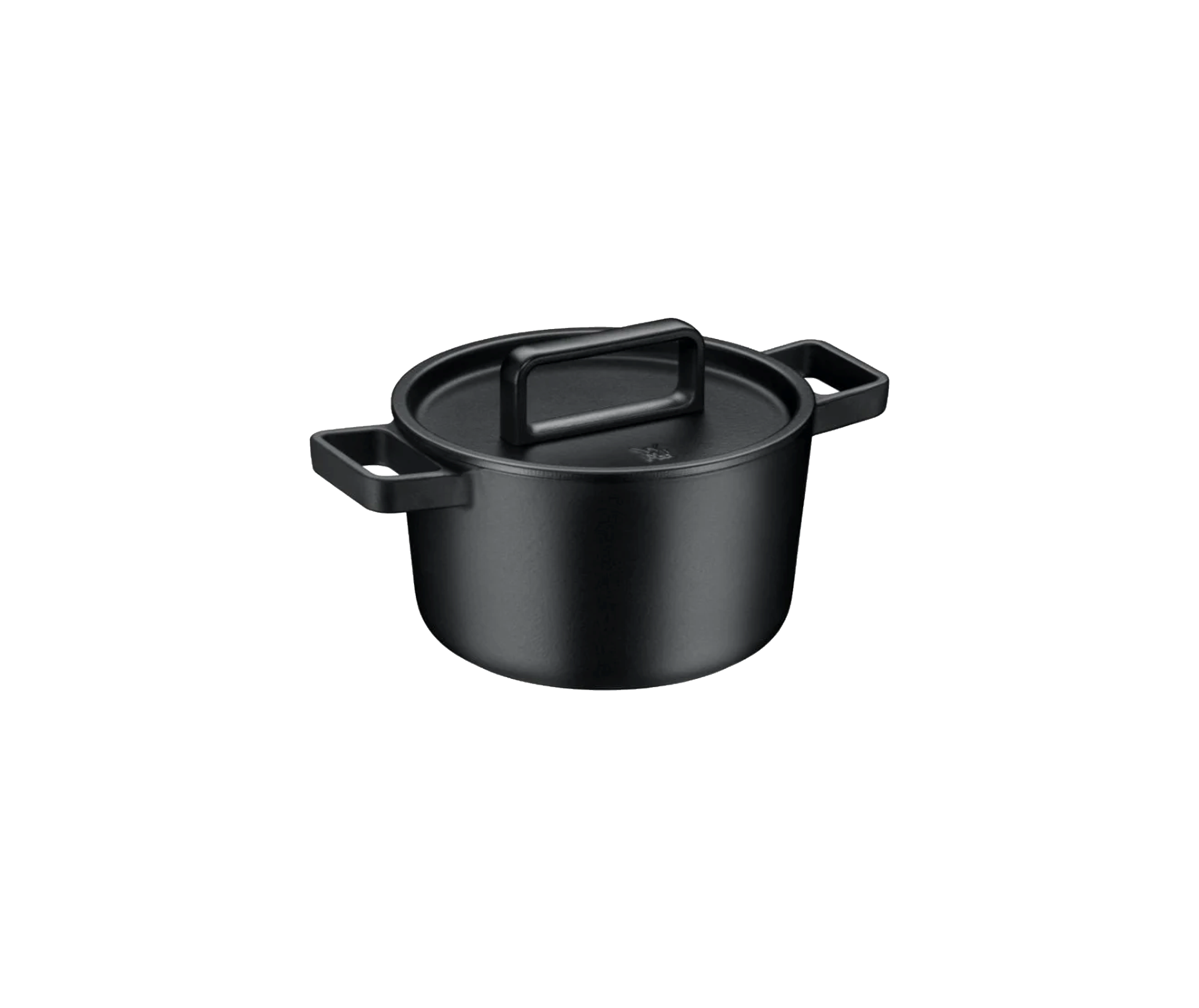 [Finishes: black] | Cast iron, matte enamel exteriorØ 22cm, 4.3LHandwash Only | From homemade coq au vin and beef bourguignon to delicious stews and casseroles and creamy risottos – cast iron cookware, thanks to its outstanding heat conduction and retention, offers the best conditions for delicious meals. WMF's Flavor Cast Iron Cookware brings this traditional material into the modern age and marries modern design with unmatched craftmanship. Each handcrafted pot is a testament to artisanal skill with individuality in every piece. The pieces exude modern elegance, with the conical silhouette of the pot alternating with the striking lines of lid and flowing ergonomic handles. The range promises more tender and flavorful results than ever before thanks to an innovative condensation lid which preserves up to 25% more liquid/juice inside the pot. The elegant black roasting pan with a diameter of 22 cm is a successful all-in-one solution for braising, roasting, baking, and stylish serving.