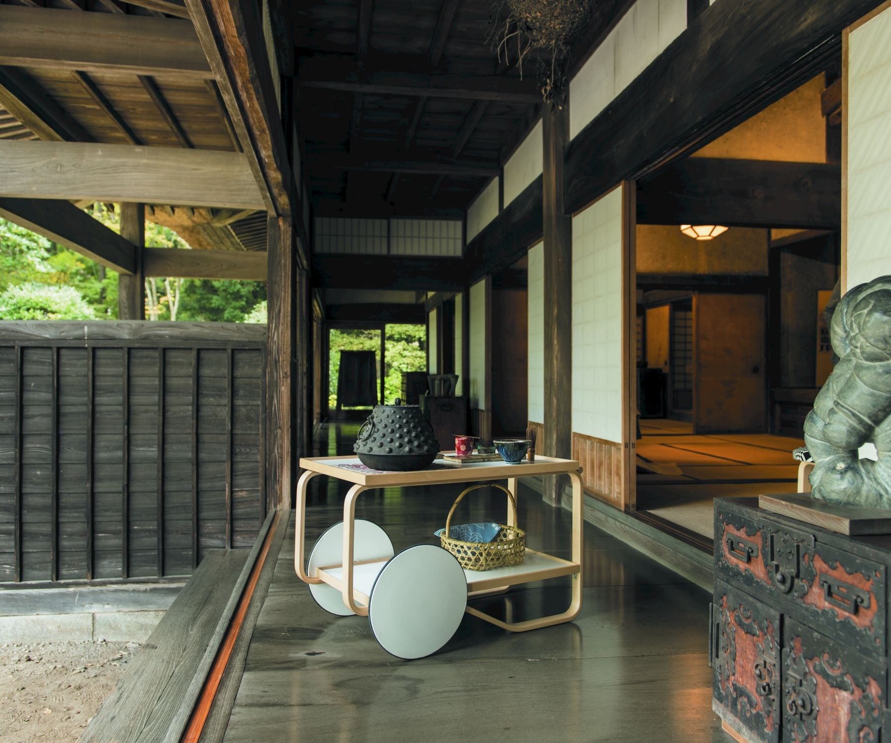 The tea trolley was inspired by British tea culture, which Aino and Alvar Aalto had become acquainted with though their many travels, as well as by the Japanese woodwork and architecture they admired. With a frame composed of two birch lamella loops, Tea Trolley 901 features two shelves and a solid birch handle. Twin wheels, in combination with the lightweight quality of birch, mean the trolley can be easily maneuvered and parked at will. Over the years, numerous variations of the Tea Trolley have been produced. Dutch designer and colour expert Hella Jongerius delved into Artek’s archives to offer her own take on one of Alvar Aalto’s most cherished products. Her subtle interventions resulted in a light and a dark version of the trolley, which play with the shifting light on the product’s upper and lower trays. | 90 x 50 x h56 cm Frame: birch, natural lacquered Shelves: white linoleum Wheels: white with black rubber ring | Tea Trolley 901 Specifications