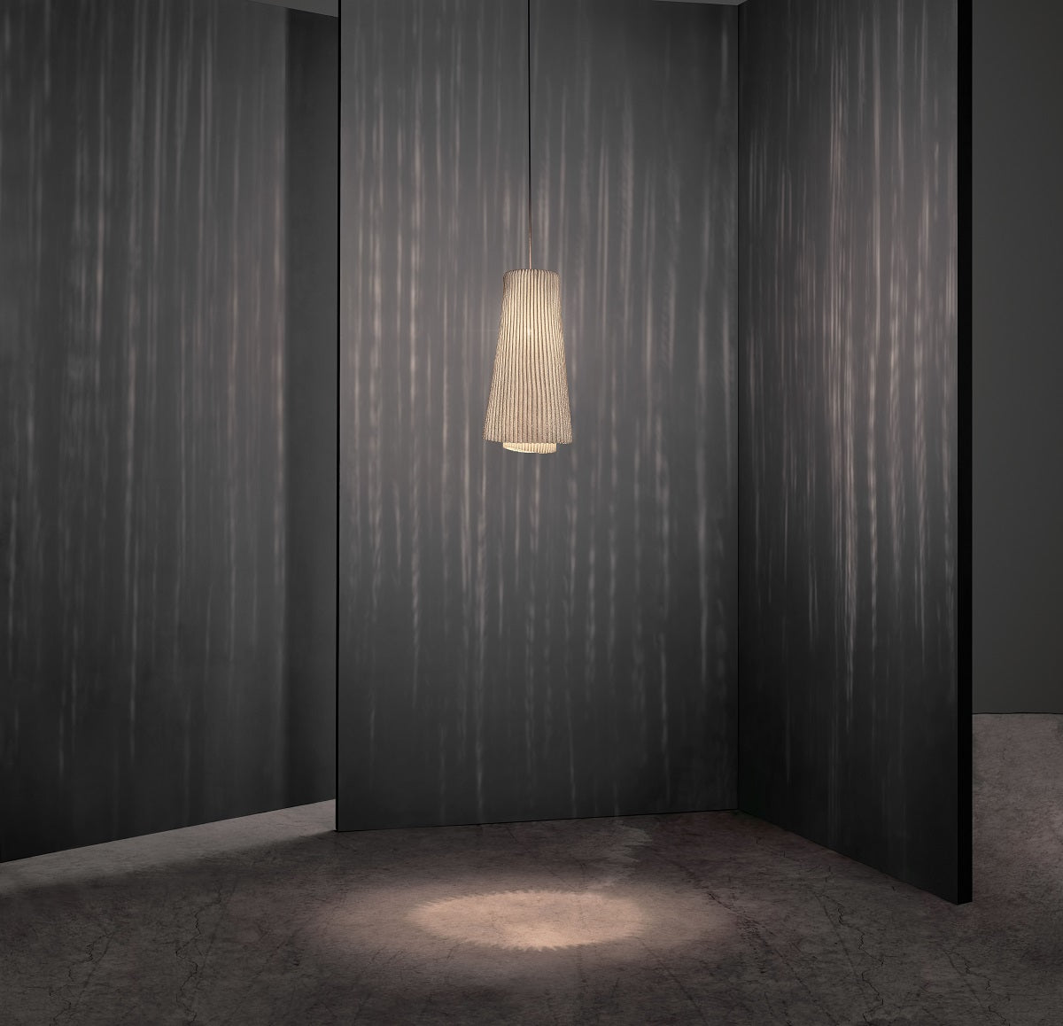 [Finishes: Grey mesh] | Tempo is a pendant lamp collection made with painted stainless steel mesh. This material, crafted in fine pleats, forms two overlapped layers that create two different lamps full of dynamism. Andante and Vivace, two liveliness shapes born from one. The representation of two instants generated by the same movement at a different tempo. | 24 x 25 x h50 cm | Materials: Painted stainless steel mesh. | Tempo Andante Pendant Specifications
