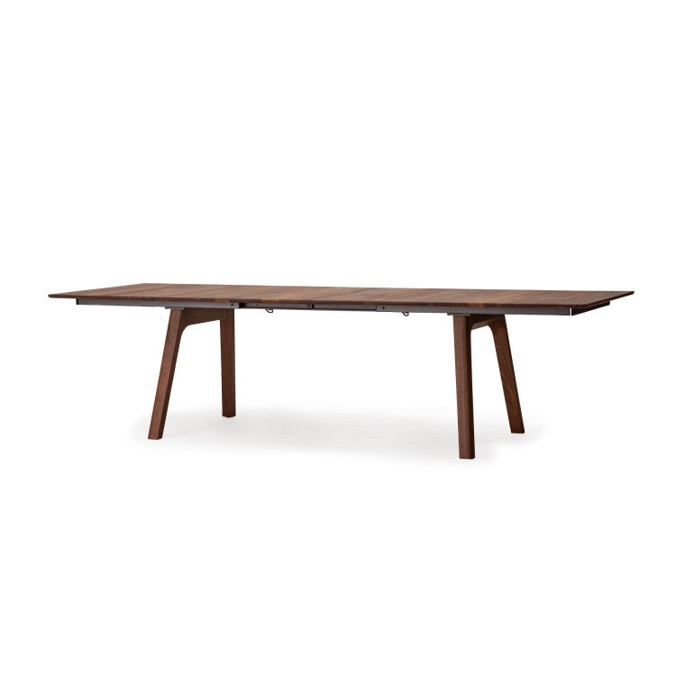[Finishes: Natural walnut] | The TEN Extension Table can be brought to its full length with great ease, as the top board glides smoothly and effortlessly to extend without lifting any part of the table. A soft close mechanism prevents slamming or other difficulty when stowing the extendable portion, and the seam is nearly invisible both in default and extended configurations. The extended configuration can seat up to 10. | The edges of the top are carefully sanded into delicate angles, creating the table’s signature smart & light appearance. The sturdy legs carved out of thick solid wood provide visual appeal with the intriguing shadows they cast. Enjoy the rich wood grain and quality of solid wood no matter what occasion. | The theme of this series is taking flight into an endless sky. Soft edges and gently curving pieces can elevate your space, giving it a simple & clean, sleek atmosphere. | 210/280 x 100 x h75 cm | Finish: walnut OFN, extendable