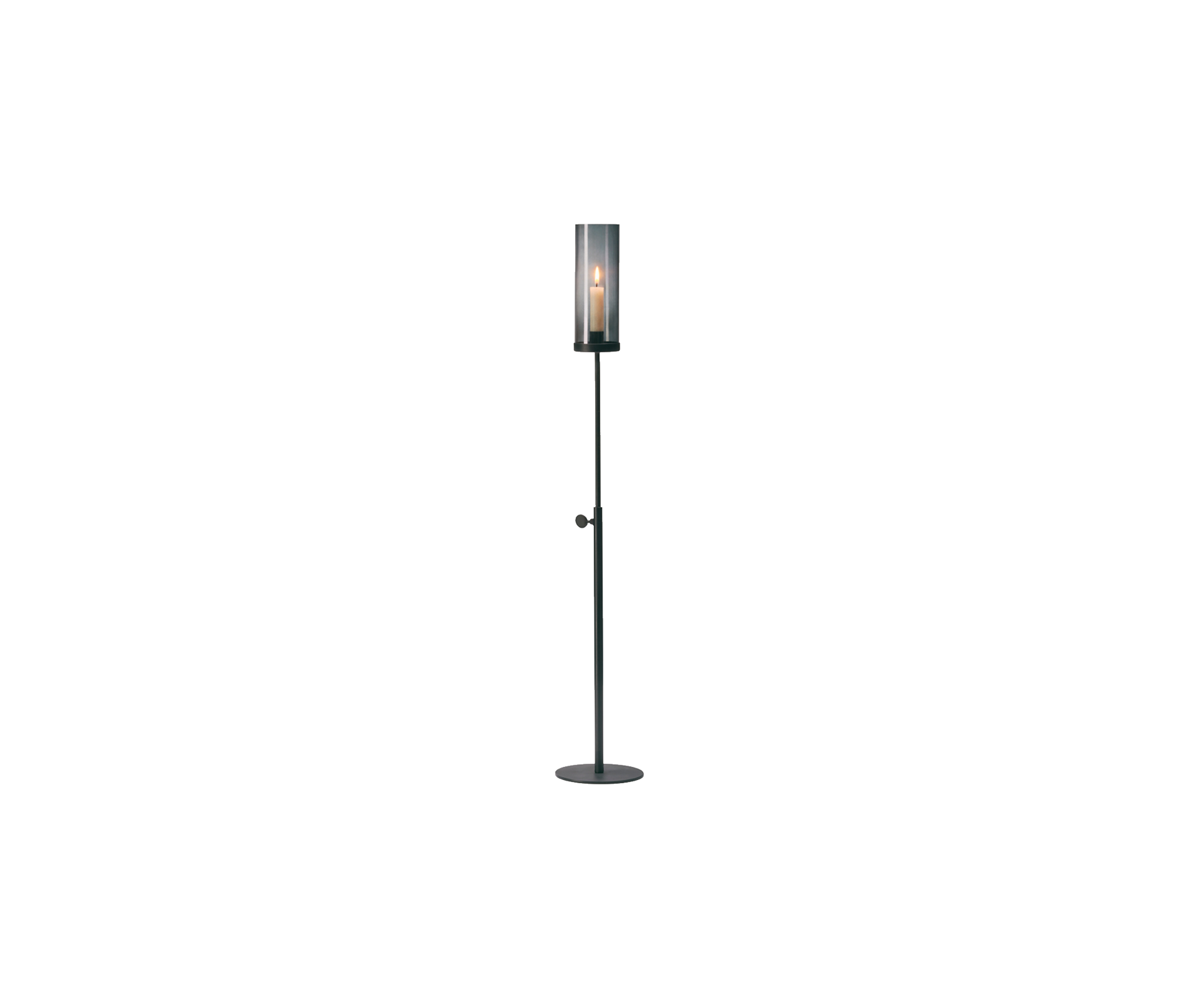 [Finishes: anthracite powder-coated] | Finish - powder-coated steel, borosilicate glassDimensions: 15cm x 15cm x 50cm h | Even the most established lighting manufacturers worldwide are wide-eyed: A functional candleholder, stealing the limelight from many a design-award-winning floor lamp. Here, wattage numbers don´t matter the feel-good factor is what counts. And on a scale of 1 to 10, it comes in at 12. Flickering is also allowed, which is far from any kind of guarantee claim. Minimalistic Design, height adjustable, maximum easy use: Fire = on, Blow = off. It´s got charm, that´s for sure.