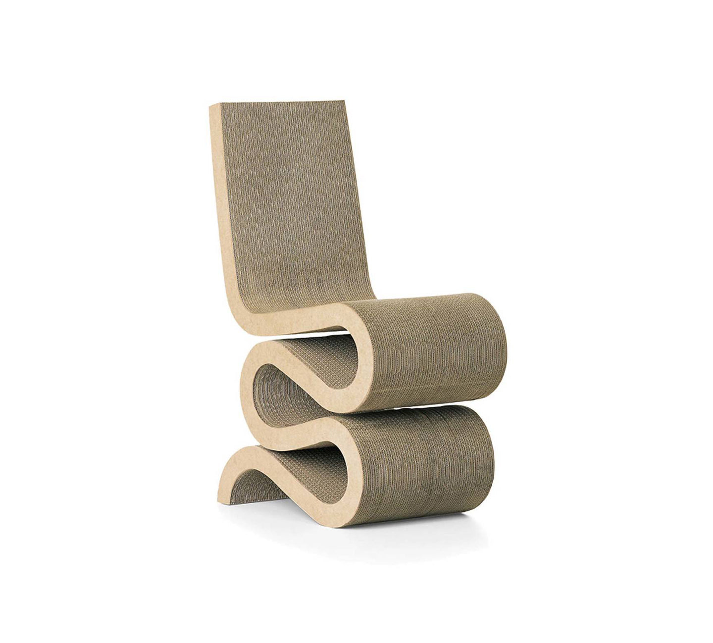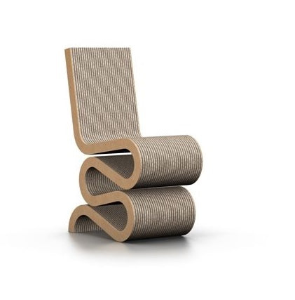 The architect Frank Gehry is known for his use of unusual materials. With his furniture series 'Easy Edges', he succeeded in bringing a new aesthetic dimension to such an everyday material as cardboard. | The sculptural form of the Wiggle Side Chair makes it stand out. Although surprisingly simple in appearance, it is constructed with the consummate skill of an architect, making it not only very comfortable but also durable and robust. | Material: corrugated cardboard. Edges: hardboard. | Wiggle Side Chair Specifications